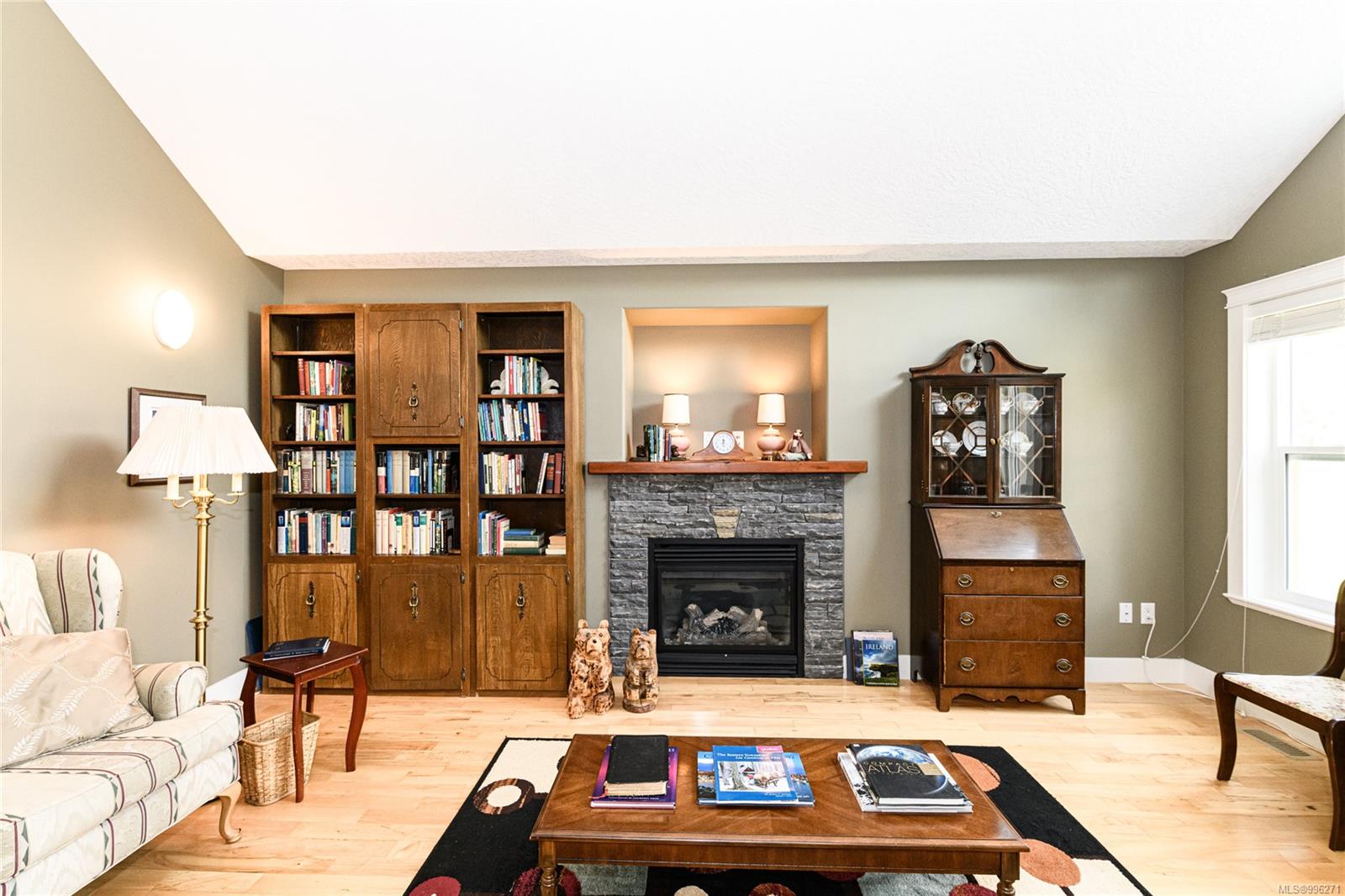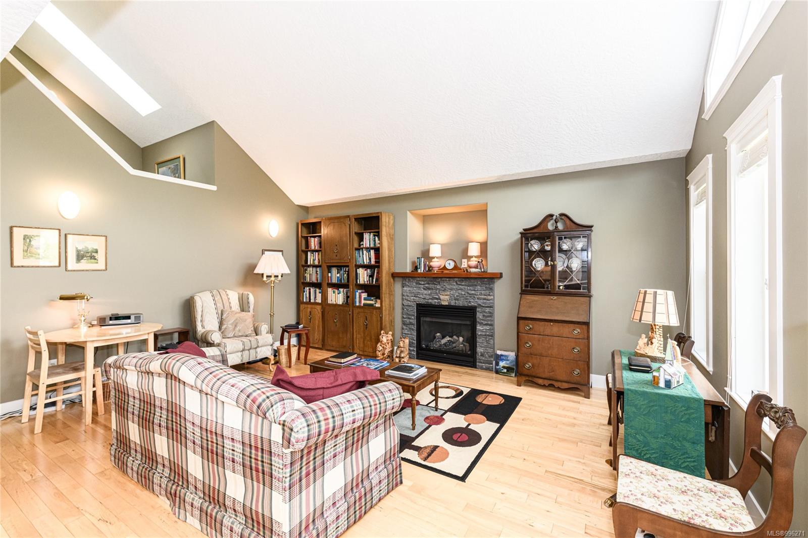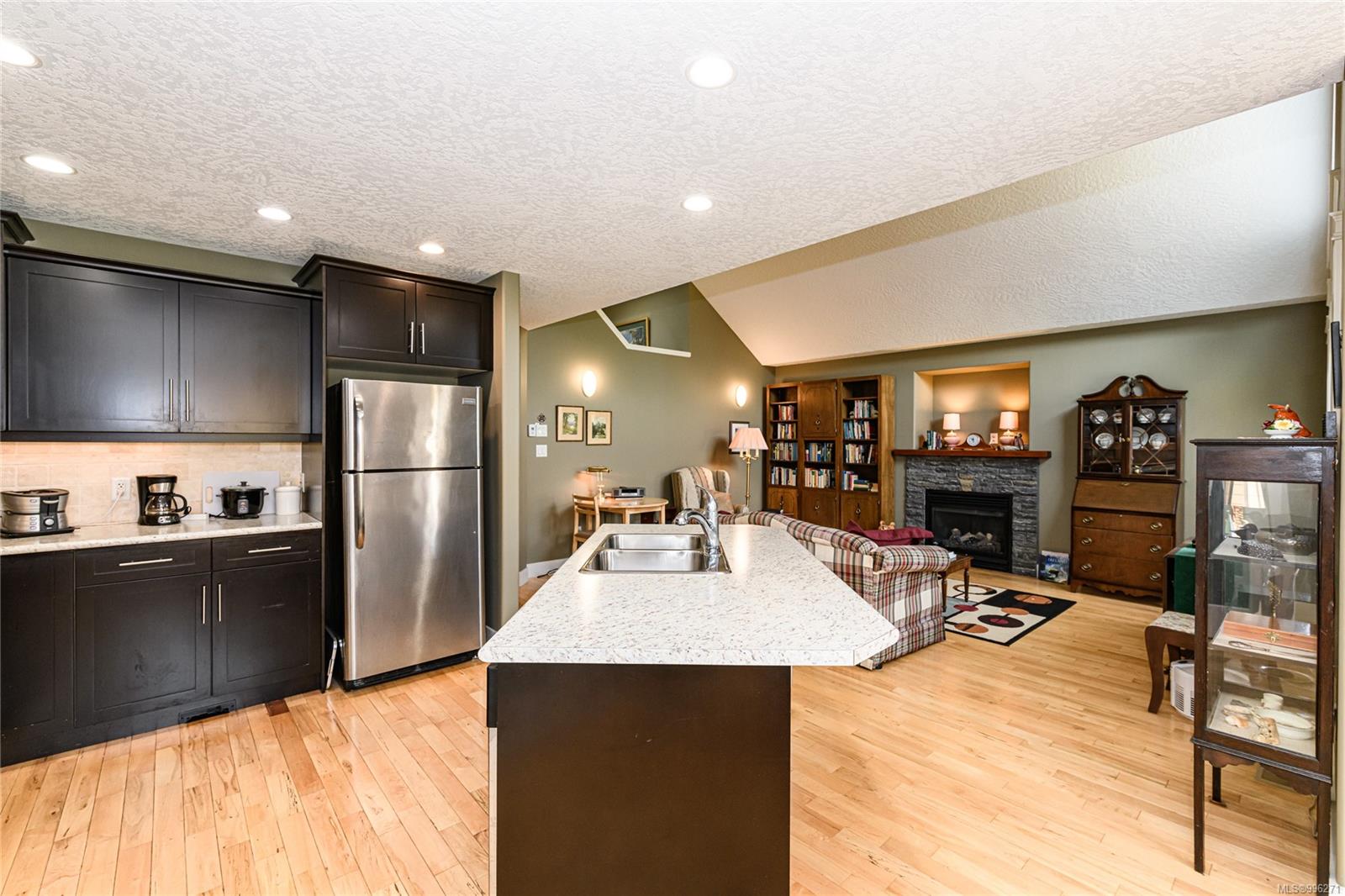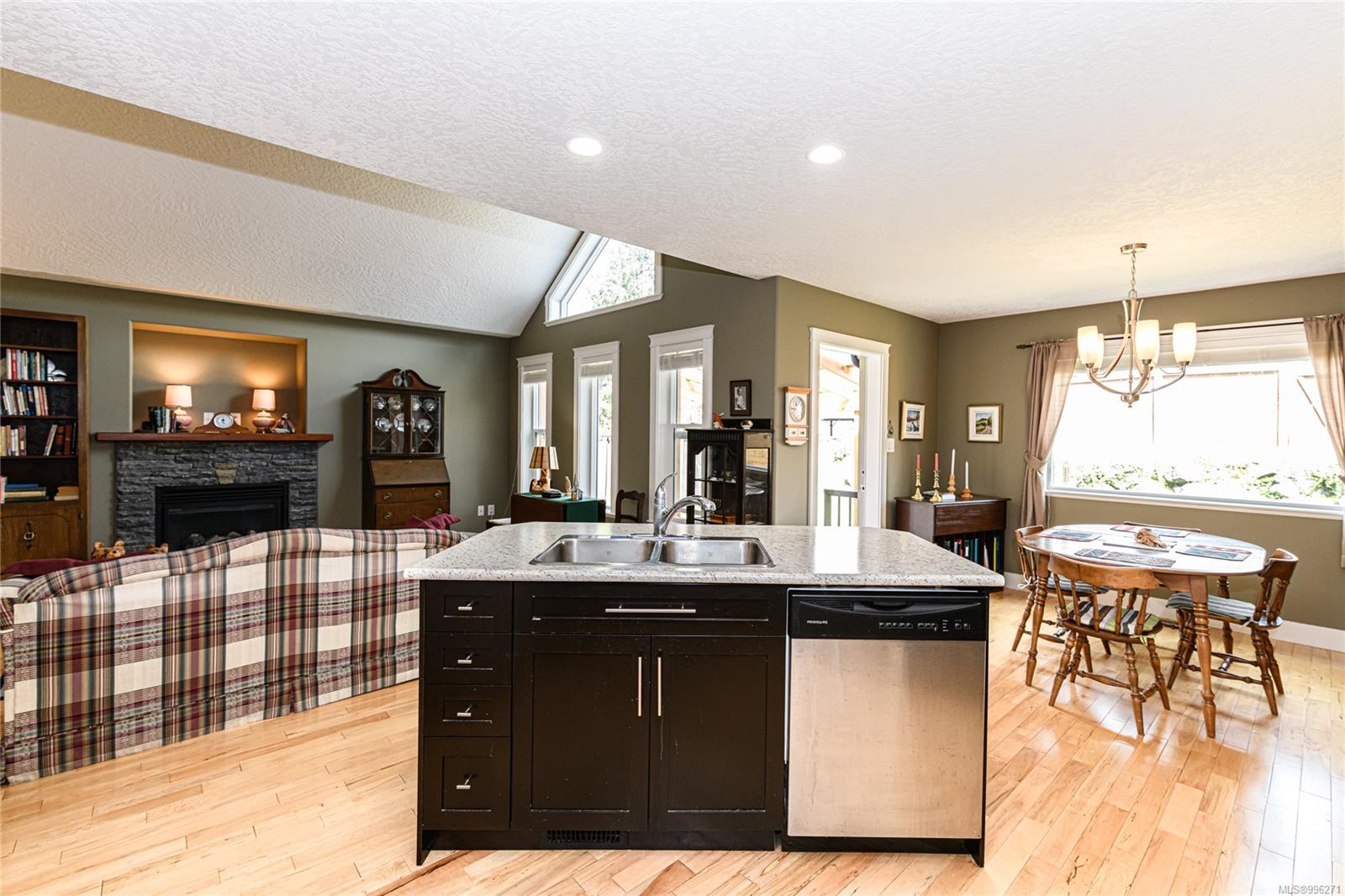 Step into the open-concept living space, where vaulted ceilings and an abundance of natural light create a warm and airy atmosphere. A cozy gas fireplace adds charm and comfort, while hardwood floors flow throughout. The kitchen is both functional and family-friendly with roughed in central vacuum (including a kitchen sweeper) and direct access to the backyard patio—perfect for entertaining. The home offers ample storage, including under-stair space and a clean, accessible crawl space. A high-efficiency furnace, heat pump, thermal windows, and utility sink in the double garage ensure the home is both energy-efficient and practical.